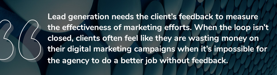 Lead generation needs the client’s feedback to measure the effectiveness of marketing efforts. When the loop isn’t closed, clients often feel like they are wasting money on their digital marketing campaigns when it’s impossible for the agency to do a better job without feedback.